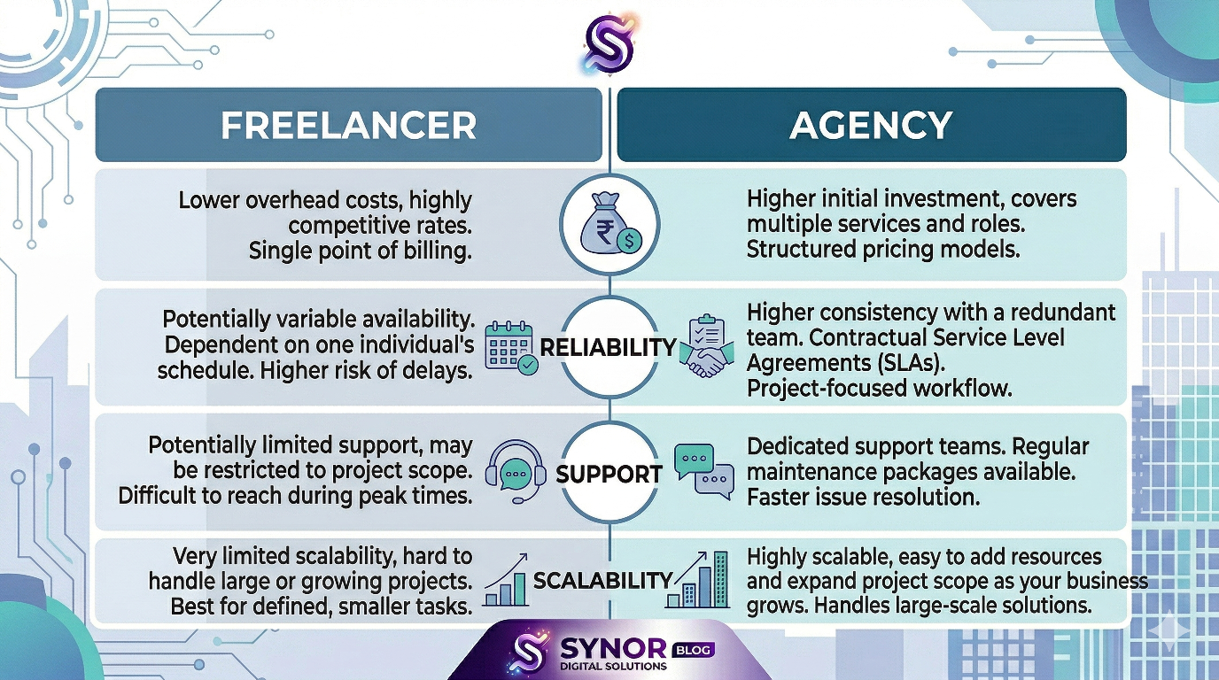 Agency: Higher upfront, but usually all‑inclusive. At SYNOR, our packages start at ₹18,000 — domain, hosting, SSL, design, SEO, support included. No surprises.